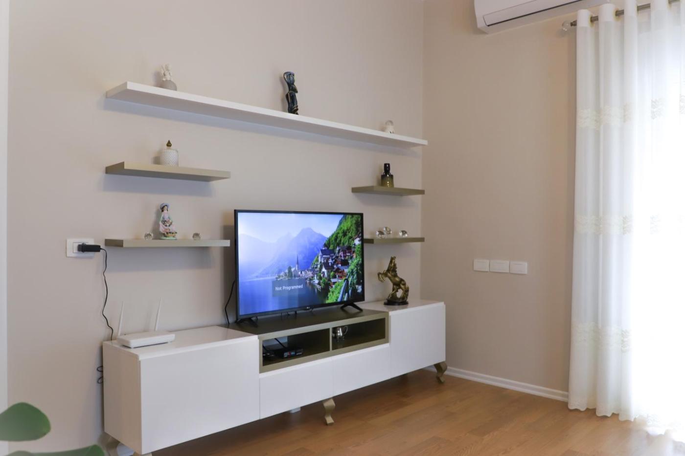Apartment. This spacious apartment includes 1 living room, 2 separate bedrooms and 2 bathrooms with a walk-in shower and a bidet. Guests can make meals in the kitchen that is fitted with a stovetop, a refrigerator, a dishwasher and kitchenware. The air-conditioned apartment offers a flat-screen TV with cable channels, a washing machine, soundproof walls, a tea and coffee maker as well as mountain views. The unit has 6 beds.