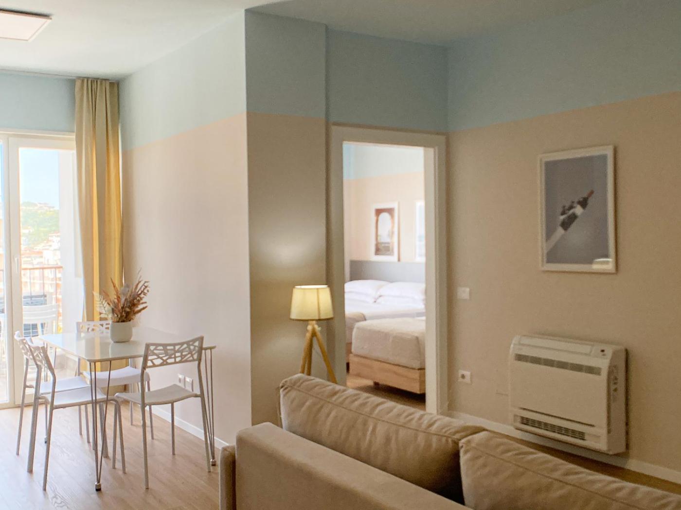 One-Bedroom Apartment with Sea View. Boasting a private entrance, this air-conditioned apartment features 1 living room, 1 separate bedroom and 1 bathroom with a walk-in shower and a hairdryer. Meals can be prepared in the well-fitted kitchen, which has a stovetop, a refrigerator, kitchenware and an oven. Featuring a balcony with sea views, this apartment also features a washing machine and a flat-screen TV. The unit has 3 beds. ;